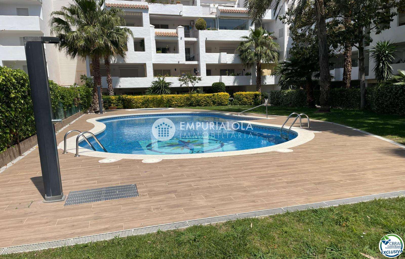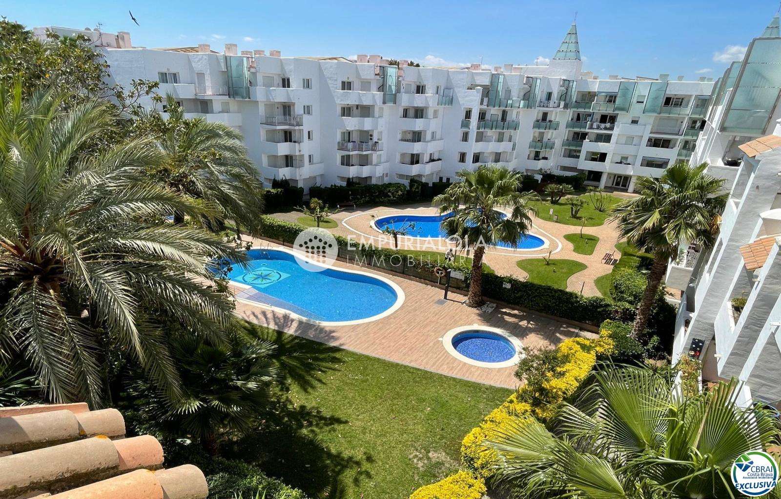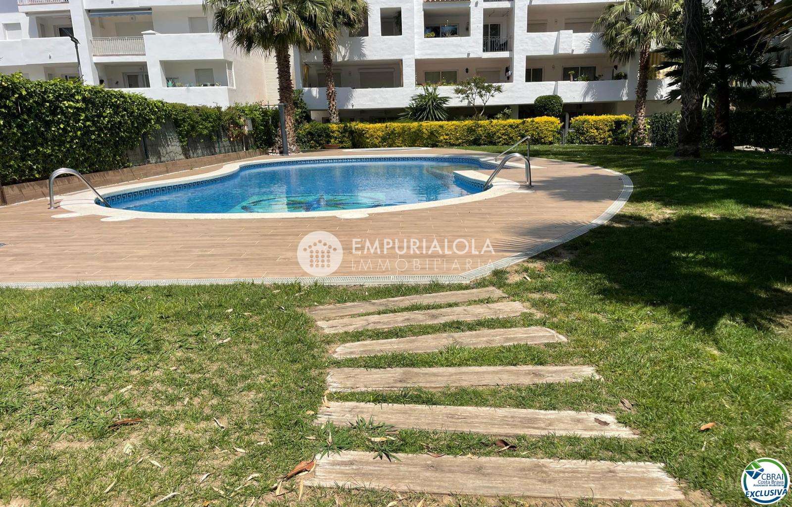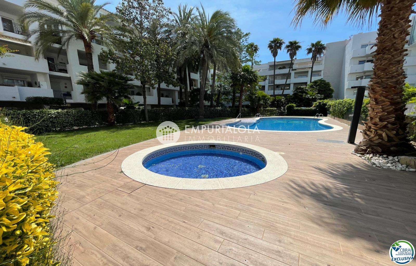 Beautiful, romantic, and cozy apartment in a luxury building with a concierge reception, a lovely garden, a natural grass pool, plenty of communal parking, and a mooring for rent in the same building. The apartment consists of an entrance hall, a spacious full bathroom, an open-plan kitchen equipped with cabinets, appliances, and a pantry-storage closet, a bright living-dining room with access to the furnished and sunny terrace, a double bedroom with a built-in wardrobe and access to the terrace, and an 8m2 terrace with beautiful unobstructed views, an awning, and all-day sun. Quiet area with wide streets and sidewalks, 1.5 km from the beach.